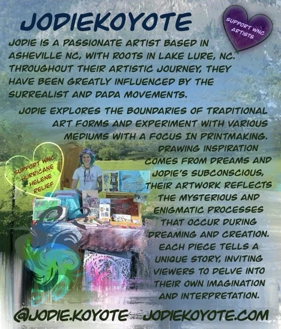 Jodie has strengthened their craftsmanship with a Bachelor's degree in Fine Arts and a Minor in Art Management and Entrepreneurship from the University of North Carolina at Asheville. They have cultivated a profound love for creating through drawing, painting, printmaking, photography, music, and collage.